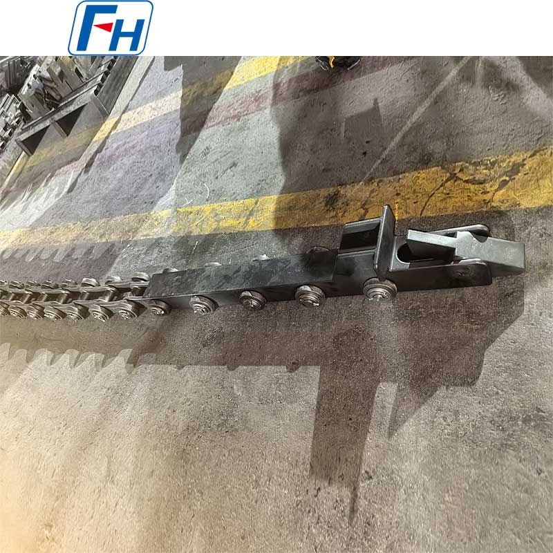 A: Measure chain elongation. Replace when elongation exceeds 2–3% of original length. Also inspect for worn pins, cracked side plates, or seized links. FH® offers replacement chains with the same attachment spacing.